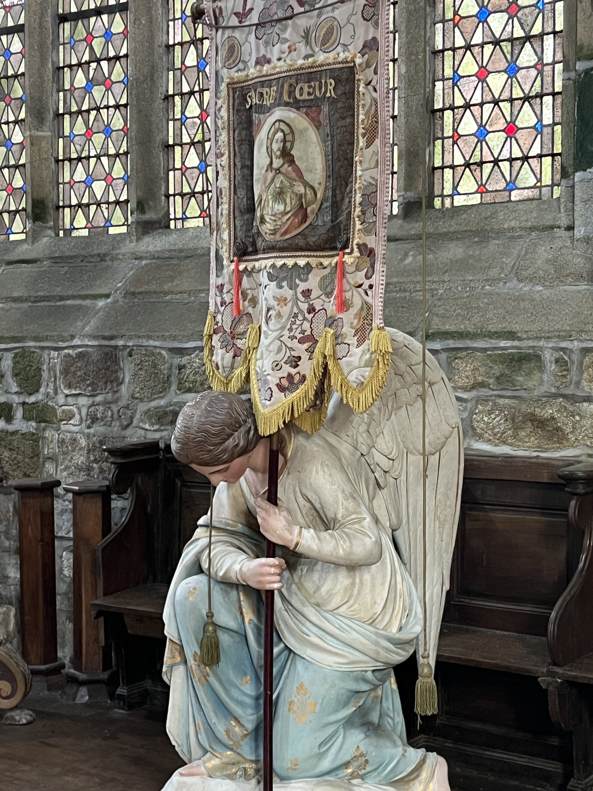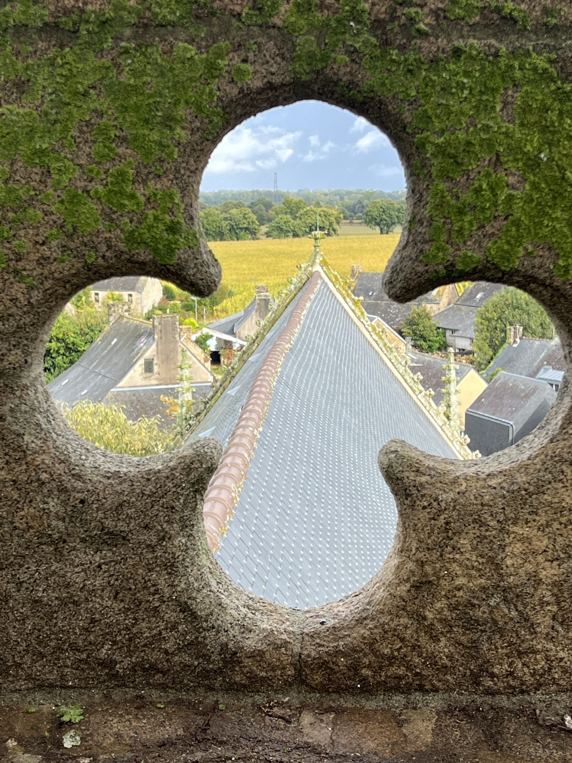 Concernant l’hermine de Bretagne : les armoiries visibles sur la verrière incluent le signe de l’hermine, l’emblème du duché de Bretagne — confirmant le lien de la famille des Coatmen avec la maison ducale.