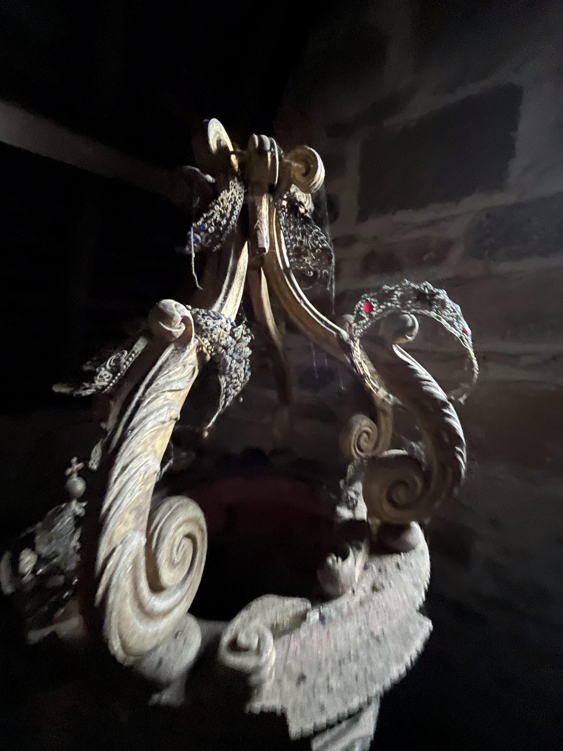“La dame, elle a l’égypte avec l’emblème de Coatmen, et derrière c’était son emblème de sa famille. A noter qu’il y a l’hermine aussi, les blancs, vous voyez, il y a le signe de l’hermine de Bretagne.”